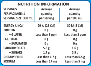 Nutritional Information : 25 calories per 330ml serve. Carbs : 5.3g per 330ml serve. Gluten : less than 3 ppm per 330ml serve.